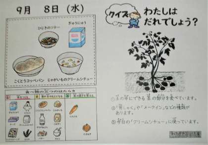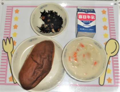 本日の献立は「ひじきのソテー,牛乳,黒糖コッペパン,じゃがいものクリームシチュー」です。「ひじきのソテー」にはミックスビーンズが入っており,栄養抜群です。