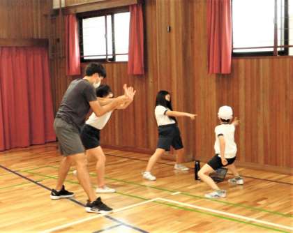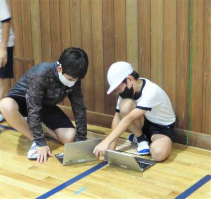 自分たちの動きをタブレットで確認し,「まだ,腰を下げられるな。」や「腕をもっと大きく振ろう!!」など,グループごとに細かなところを練習しています。