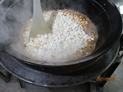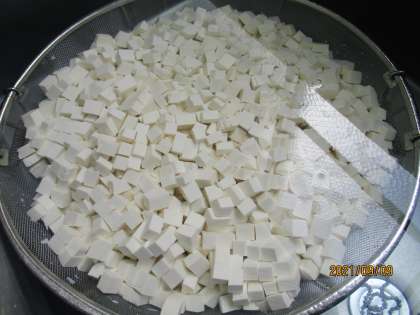 みじん切りにしたしょうがと豚ひき肉,たまねぎを炒め,チキンスープで煮たあと,赤みそ,トウバンジャン,テンメンジャンなどで作った調味液で味付けをします。さいの目切りにしたとうふを入れて煮込み,最後に水どきの片栗粉を入れて完成!