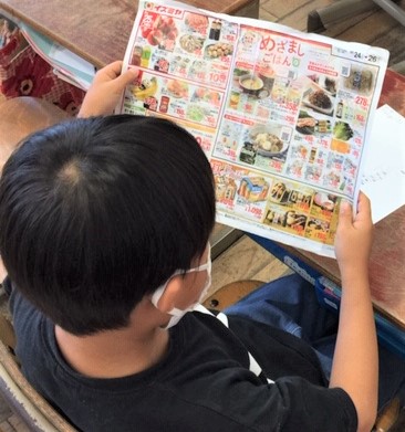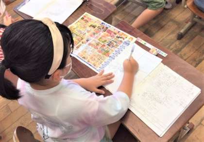 品物の産地をスーパーの広告を活用して調べ,白地図にまとめていました。そこから他地域とのつながりを理解し,その理由についても考えていました。