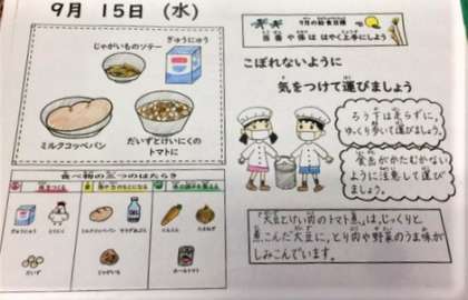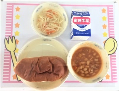本日の献立は「じゃがいものソテー,牛乳,ミルクコッペパン,大豆と鶏肉のトマト煮」です。「大豆と鶏肉のトマト煮」は,大豆をじっくりと煮こみ,鶏肉や野菜のうま味がしみこんでいて,美味しかったです☆