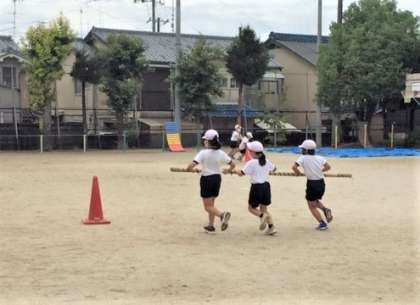 どのようにしたら速くコーンをまわれるのか,みんなが当たらずに棒を跳び越えられるのかを考え,工夫し,競争を楽しんでください☆