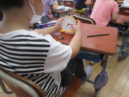 時計の模型を操作しながら「何時何分」の問題を解いていました☆