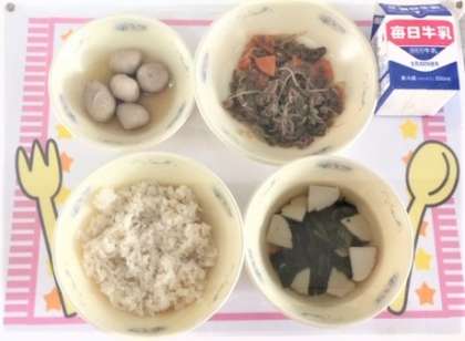 「里芋の煮つけ,牛肉のしぐれ煮,牛乳,麦ごはん,すまし汁」です。