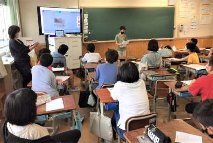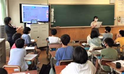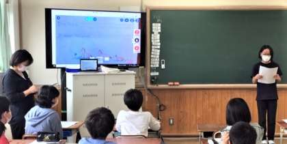 「I went to / ate / saw / enjoyed 〜.」「 It was 〜.」 などの表現を使って,夏休みの一番の思い出と感想を発表しています。