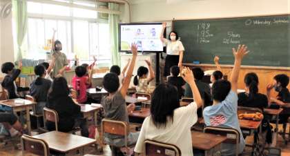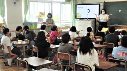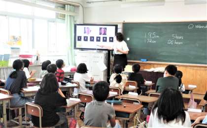 早速,5年生の外国語科の授業に入り,家族のことや好きなスポーツ・食べ物・色など,クイズを交えて楽しく自己紹介をしていました。