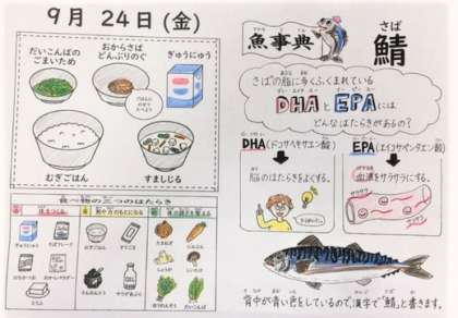 本日の献立は「大根葉のごま炒め,おからさばどんぶりの具,牛乳,麦ごはん,すまし汁」です。脳の働きをよくする「DHA」,血液をサラサラにする「EPA」が鯖の脂には多く含まれているようです。