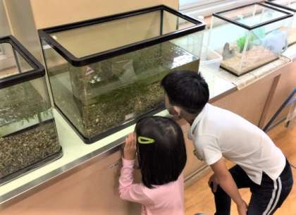 学校探検をした時のことを思い出し,理科室へGo!!メダカや金魚を観察し,絵と文章で気が付いたことをカードにまとめていました☆