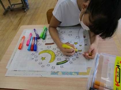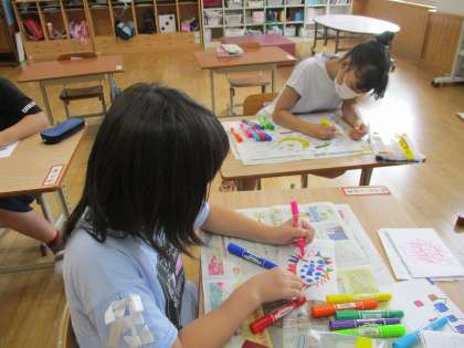 5年生は,運動会で使う旗を作っています。いろいろな色のペンを使って,カラフルな絵をどんどん描いていきます。「旗を振るのが楽しみ!」とにこにこ。運動会,晴れますように!