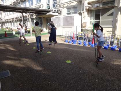 昨日の朝会で,教頭先生が竹馬の遊び方について紹介してくださいました。早速,コーンの間をジグザグに通って遊んでいたり,足を載せる位置を高くして遊んでいたりする姿が見られました。スポーツの秋です。気持ちの良い気候の中,どんどん外遊びをしてほしいです!