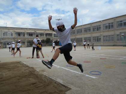 5年生の体育では走り幅跳びの学習を行っています。「トントントーン」のリズムで,「手を振り上げて」を合言葉に記録に挑戦しています。計測や準備も自分たちで協力して行っています。