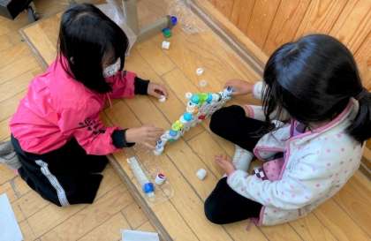 ペットボトルやキャップ・空き箱など,集めた物の特徴を生かして,積んだり,転がしたり,はじいたりしながら遊びを考えていました!!