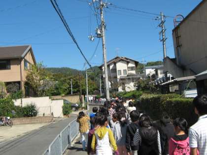 校内放送が流れ,列をつくって第2グラウンドまで避難します。第2グラウンドまでは少し歩いていかなければなりませんが,みんな真剣な表情で避難できました。