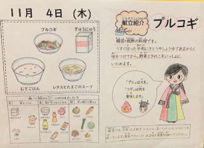 本日の献立は「プルコギ・牛乳・麦ごはん・レタスとたまごのスープ」です。