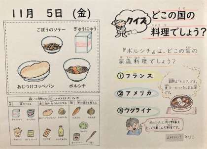 本日の献立は「ごぼうのソテー,牛乳,あじつけコッペパン,ボルシチ」です。『ボルシチ』はどこの国の料理でしょう??正解は…「ウクライナ」でした☆