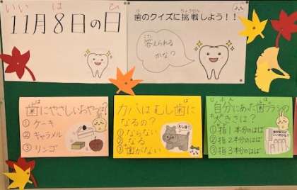 保健室前に,「歯に関するクイズ」をたくさん掲示しています。