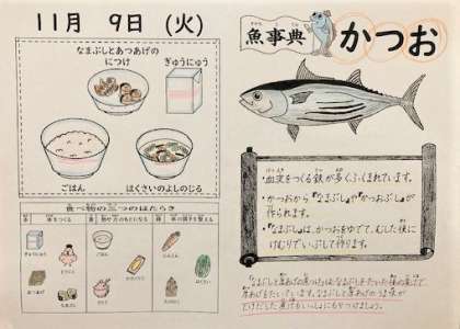 本日の献立は「なまぶしとあつあげのにつけ,牛乳,ごはん,白菜のよしの汁」です。「なまぶし」を炊いた後の煮汁で炊いた「厚あげ」は,うま味がしみこんでいて美味しかったです☆
