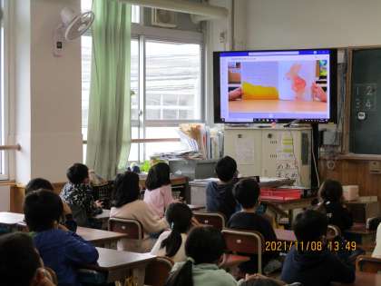 昨日は図書委員,今日は図書サークルの方による読み聞かせビデオを視聴しました。子ども達は思ったことをつぶやいたり、登場人物の気持ちになったりして,お話の世界に入り込んでいました。