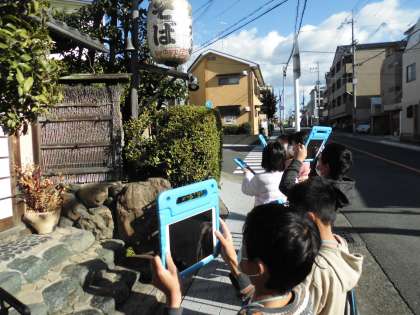 校区にあるお寺やお店を地図にマークしたり,iPadで写真をとったりしながら歩いて回りました。撮りためた写真は次の学習にいかしてくださいね☆