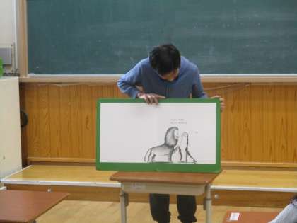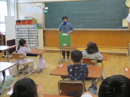 昨日に引き続き,6年生が読み聞かせをしてくれました。今日の本は「ねずみくんのチョッキ」です。登場人物がたくさん出てくるお話でした。人物に合わせて声の調子を変えたり,聞いている人の方を見ながら読んだり,と今日も工夫がいっぱいでした。「上手だな。」と思ったという子どもたちの反応を見て,「心があたたかくなった。」と6年生も感想を言葉で上手に伝えていました。にじの子学級のみんなが,心あたたまる読み聞かせになりましたね☆