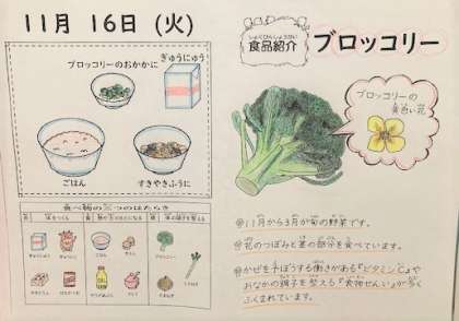 本日の献立は「ブロッコリーのおかか煮,牛乳,ごはん,すき焼き風煮」です。ブロッコリーには風邪を予防する「ビタミンC」や,おなかの調子を整える「食物繊維」が多く含まれているのですね☆