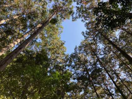 「台風」や「キクイムシ」の影響で倒れてしまった木々もたくさんあることを知りました。そんな場所で木々を見上げると,青空が見え,その形がハートに見えました。また,山の中でリコーダーを演奏したり,歌を歌ったりと素敵な時間も過ごし,とっても良い経験となりました。そして,学校に戻り,「ふりかえり」をしました。