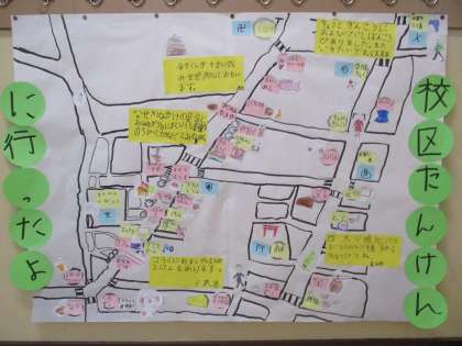 校区探検の地図が完成しました。いろいろなお店や施設は,イラストや地図記号,名前をかいて一目で分かるようにしました。よく見ると,校区探検をしている子どもたちもいます。楽しい地図ができました。