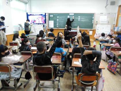 先日の「まちたんけん」で見つけたことや気付いたこと,思ったことをタブレット(写真)を活用しながら交流しました。それぞれの場所の「ひみつ」の交流から「なぜ?どうして?」という疑問がたくさんうまれ,今後のインタビュー活動につなげてほしいと思います。