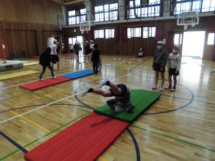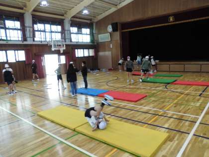 5年生は体育の授業でマット運動を行っています。場の設定を行い,もう少し頑張ればできそうな技に挑戦しています。連続技ができることを目標に練習を積んでいきます。