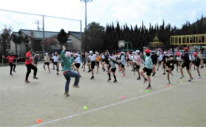 運動場では,「足が速くなるダンス」を生かした陸上教室が行われ,腕を速く振るコツや,足のストライドや回転数,「スタート時のよーいの姿勢」など,意識するだけで速く走れるようになるということを教えていただきました。教えていただいたことを今後に生かしていきたいと思います。