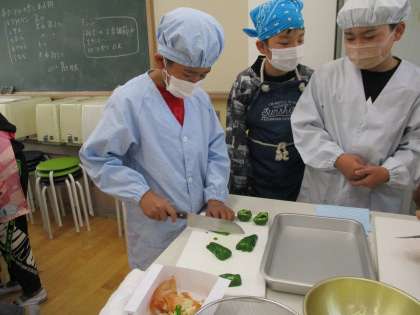 交流学級の友達と調理実習で「いろどりいため」を作りました。猫の手で押させて野菜を切ったり,長い菜箸を上手に使って炒めたり…と,グループのみんなで協力してテキパキと調理を進めていました。さて,お味は…?「おししい!」とパクパクあっという間に食べていました。