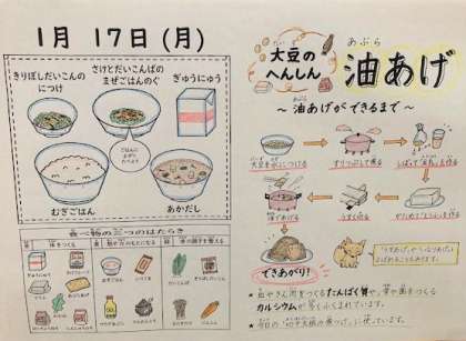 本日の献立は「切り干し大根の煮つけ,鮭と大根葉のまぜご飯の具,牛乳,麦ごはん,赤だし」です。切り干し大根の煮つけに使われている「油あげ」は,何から作られているのでしょう。