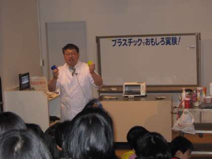 プラスティックの持つ本来の性質を教えてもらったあと,最近開発された新しいプラスティック,形状記憶プラスティック,ペットボトルのラベルの収縮実験などとっても楽しい体験をさせて頂きました。