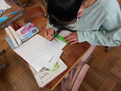 算数の「角柱と円柱」の学習で,展開図の書き方を考え,角柱や円柱の組み立てを行っています。方眼紙に展開図を書き,切り取って組み立てた図形で自分たちの町作りをしている教室もあります。休み時間も使い,進んで組み立てている子もいました。