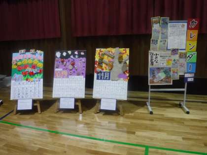 にじの子学級のコーナーは,絵や版画と,小さな巨匠展に出品予定だった北下支部の育成学級合同作品カレンダーも展示しました。