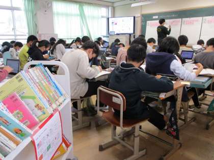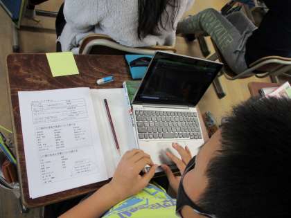 この時間から数時間は,学校図書館から配布された「パスファインダー」を参考に図書とタブレットを使って調べていきます。(パスファインダーとは,あるテーマについて調べるときに役立つ資料やツールを紹介したものです。)図書で調べるときはブックリスト欄を,タブレットで調べるときはインターネットのサイト欄を参考にすると,迷ったときに助かります。一瞬手が止まっていた児童もすぐに調べ学習に取り組むことができました。
