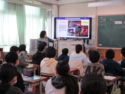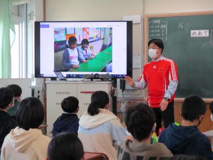 中国の国旗が入った真っ赤なスポーツウェアを着た教頭先生が,まずは中国語で挨拶をしてくれました。子どもたちは聞きなれない言語に出合いびっくり!その後のお話からは,学校の様子や町の様子,食べ物やスポーツ,行事などの文化についても知ることができました。