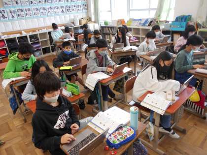 5年生の算数では,タブレットを使用して図形を描くプログラミングを作る学習を行っています。直進と回転の命令を組み合わせて,多角形を作図するプログラムを各自が考えました。様々な個性的な図形が完成し,あちらこちらで歓声があがっていました。