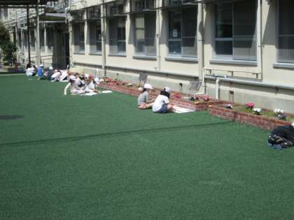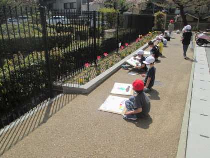 昨日,今日と,とてもいい天気なので,学校の中のいろんな所に咲いているお花の絵を描いています。自分の好きなお花を選んで,ていねいに,ていねいに・・・。2年生に進級して最初の作品です。どんな作品に仕上がるか,とても楽しみです。