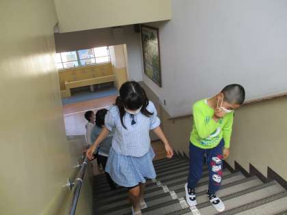 新学期が始まって三日目に,学校たんけんに行きました。いろいろな教室を見て回って場所や先生の名前を確かめました。「いろいろな教室があるね。」「みんなここにいたのね。」等と呟きながら,特別教室を見たり,交流学級の場所を確かめたりしました。