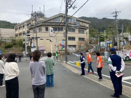 昨日は,北警察署交通課の方に,原谷口と衣笠馬場町の交差点にお越しいただき,見守り活動時の留意点などについてご指導いただきました。ご参加いただいた保護者の皆様には,朝のお忙しい時間帯にご協力いただき,ありがとうございました。