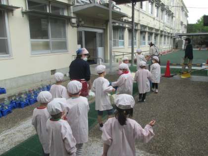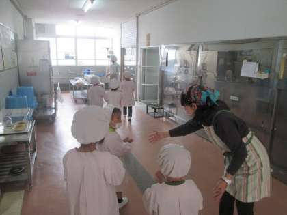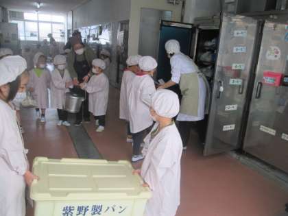 給食当番の子どもたちが,サービスホールでパンや牛乳,おかずを渡していただいて,担任の先生と一緒に教室まで運びます。つまずかないように,落としてしまわないように,みんなで気を付けながら運びます。