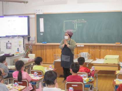 配膳を終えて,みんなで「いただきます」。新型コロナウイルス感染症拡大防止のために,みんな前を向いて,おしゃべりをせずに食べます。それでも,初めて食べる小学校の給食はとってもおいしかったようで,食べた後,「おいしかった!」と言っていた子がたくさんいました。
