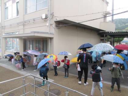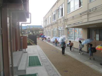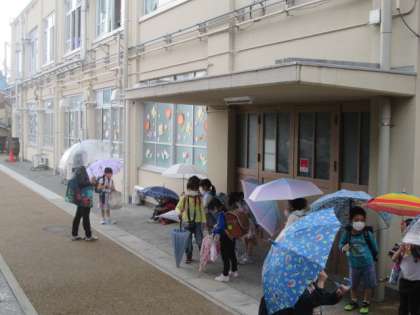 昨日まではおだやかな天気が続いていたのですが,子どもたちが帰る時刻に合わせたように雨がパラパラと降りだしました。エントランスの前でコースごとに並ぶ子どもたちも傘をさしています。