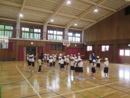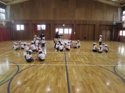 1年生が講堂で体育の学習をしています。担任の先生がおっしゃった人数のグループに集まるゲームをしています。とても楽しそうに体を動かしている1年生です。