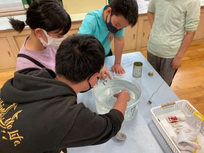 「ちっ素,酸素,二酸化炭素には,ものを燃やすはたらきがあるのだろうか。」という学習問題について予想し,実験を通して答えを導き出していました。
