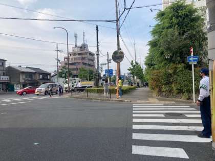 金閣小学校では,PTA愛護委員の方を中心に,すべての家庭で登校時の児童の安全の見守り活動を実施しています。