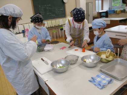 家庭科の調理実習で野菜炒めを作りました。前の時間に,栄養教諭の福井先生と一緒に包丁の使い方について学習したので,イメージトレーニングはばっちりの5年生。テキパキと何をするべきかを考えながら動いていた6年生。みんなで力を合わせておいしい野菜炒めができました。
