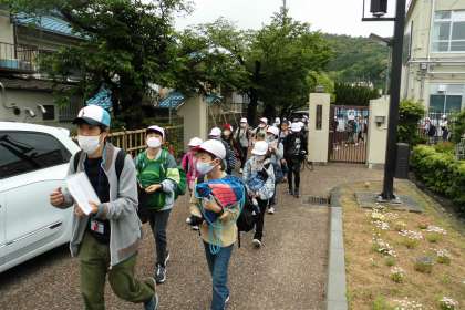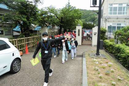出発式を終え,いよいよ京都市野外活動施設「花背山の家」へ向けて出発!!