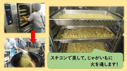 スチコンでじっくりと火を通して蒸すことで,ホクホクとした食感になり,あま味が増ししておいしくなります!